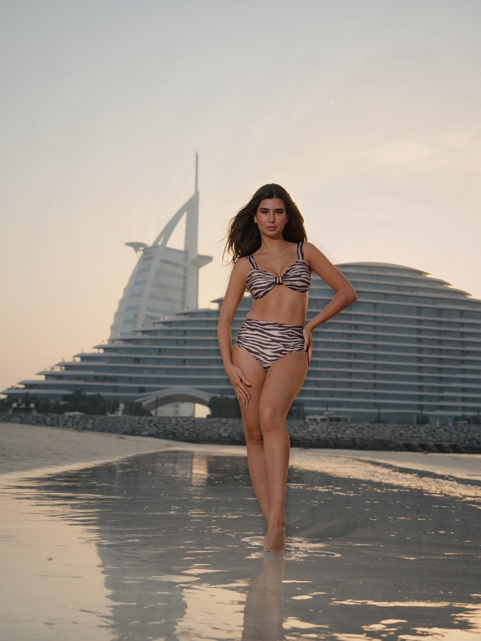 Designed for both style and support, this bold printed bikini set combines comfort with confident coverage. The top features structured cups with removable padding and wide straps for enhanced bust support, while the high-waisted bottom offers coverage with a flattering fit. Crafted from recycled fabric with UV protection, it’s a conscious choice for empowered, sun-filled days.